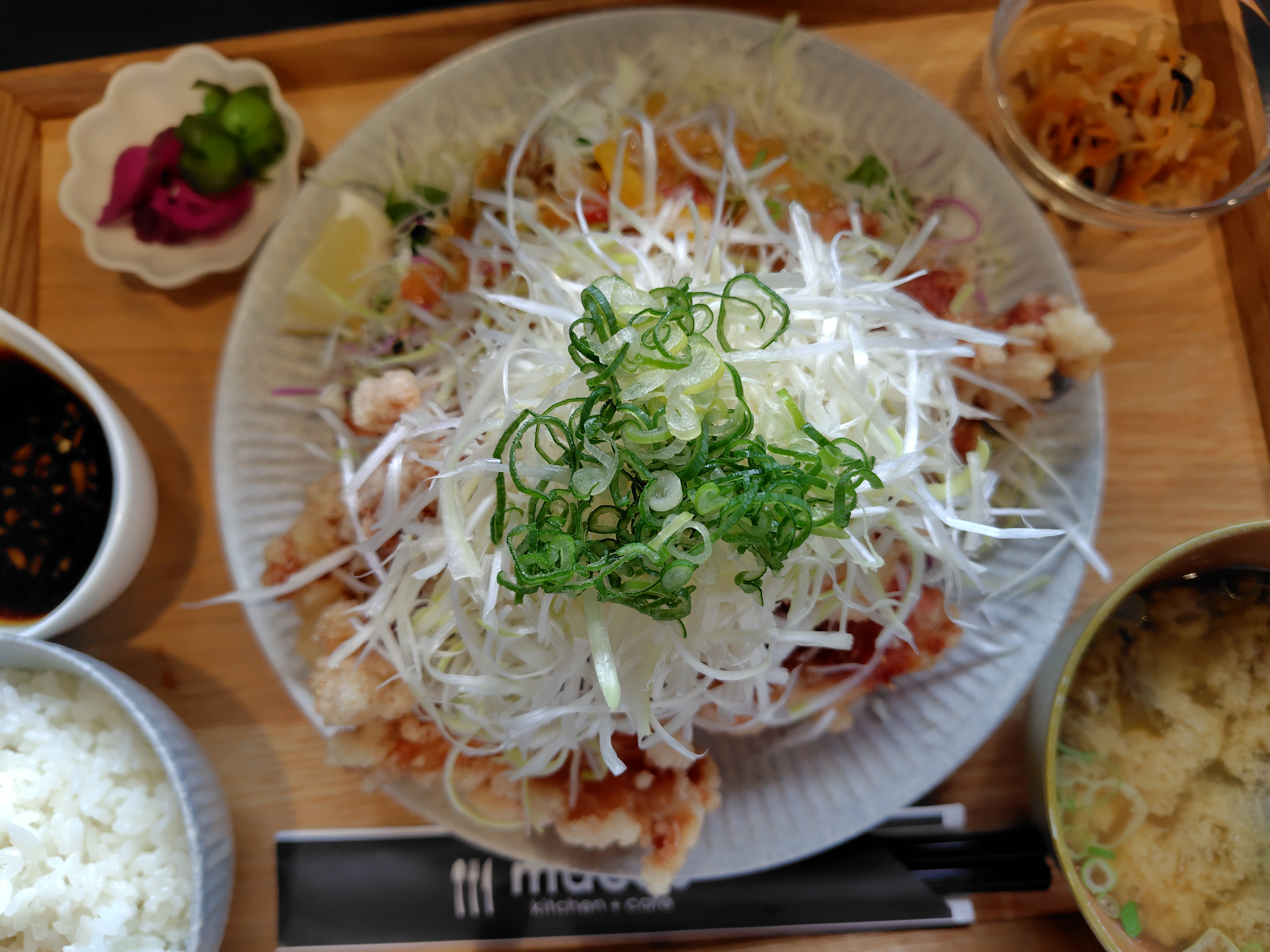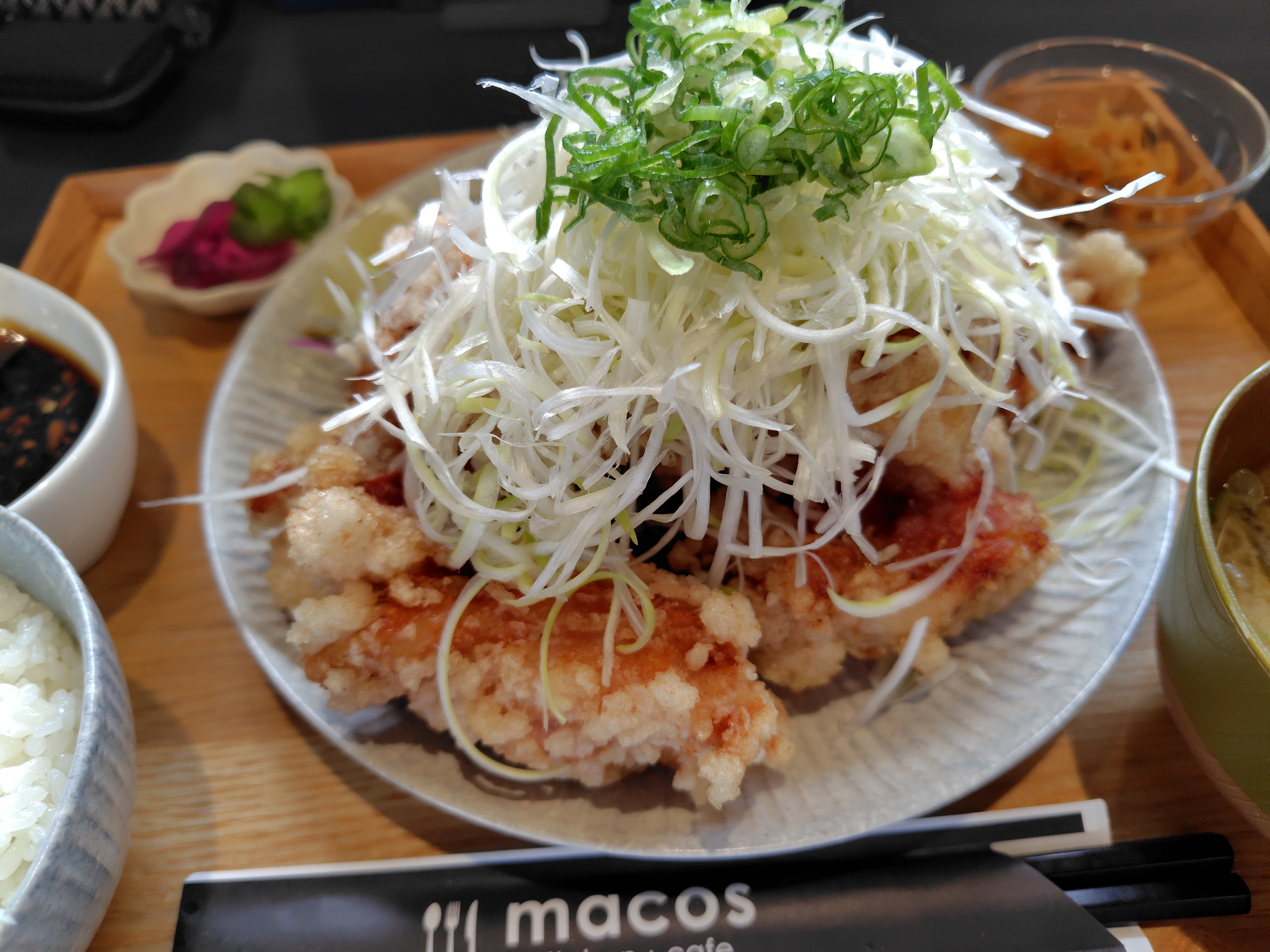 午後2時なので、空いてるかなと思いマコズキッチンに昼ご飯食べに行きました。何と、5分車で待ってると呼びに来てくれました✌️ラッキー👍お店に入って注文して会計して、テーブル座って1分で出て来ました🍴定食1380円🍽️油淋鶏定食が来た〜⤴️このボリュウム、女性の握り拳位の大きさの唐揚げが8個、大量のサラダの上に乗ってきます👍とっても美味しかったですが、半分お残しで持ち帰りました😅🤣
