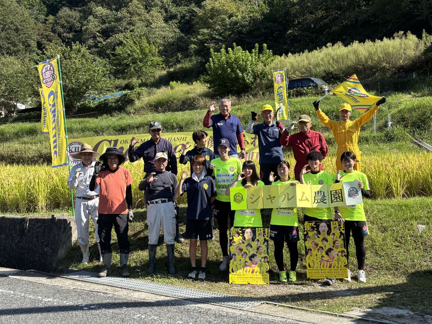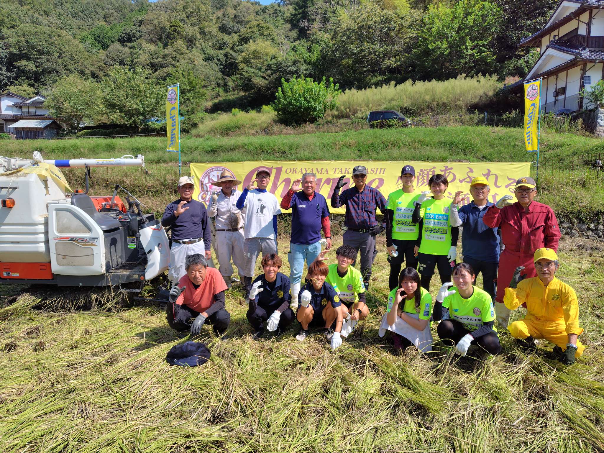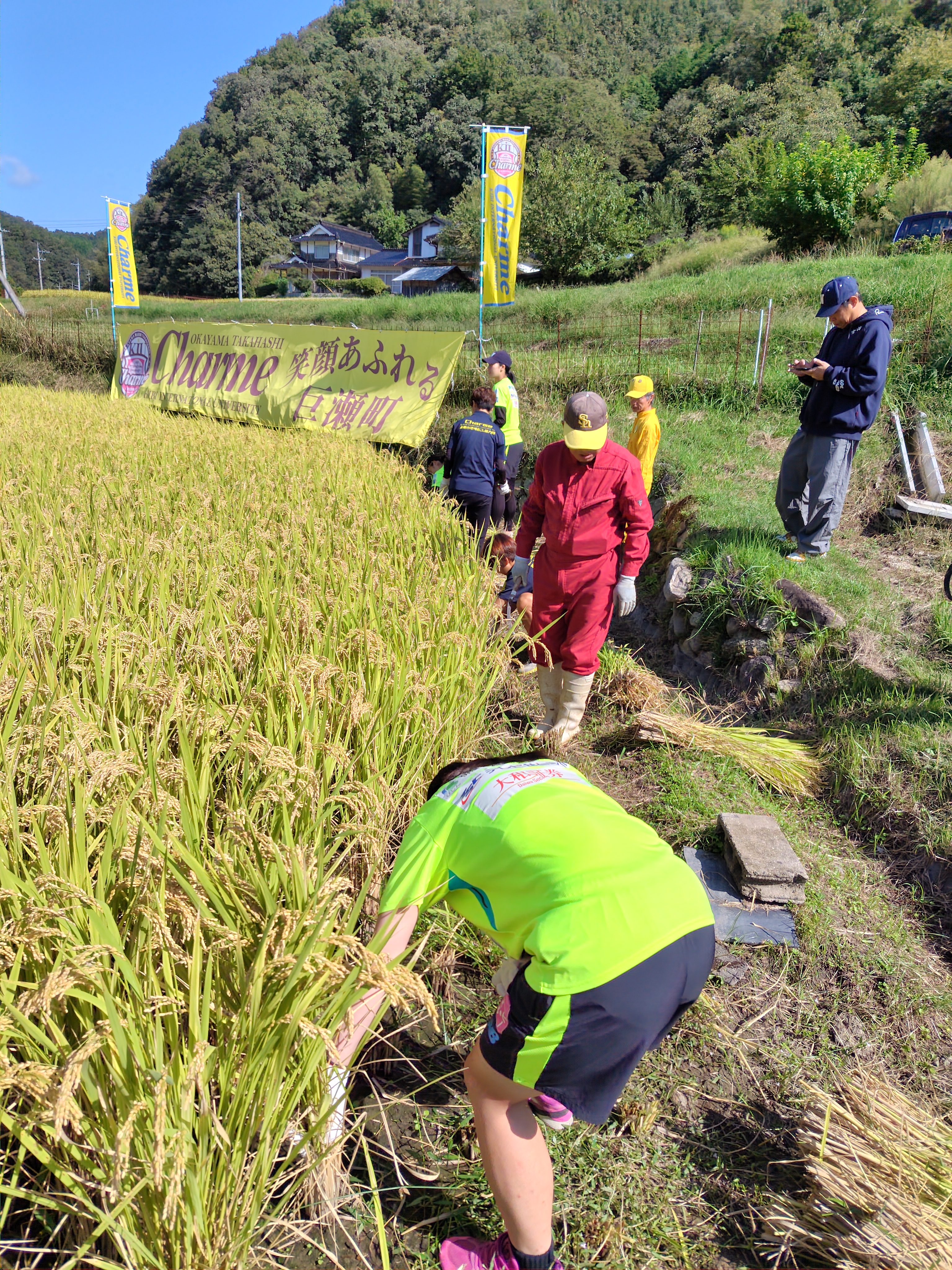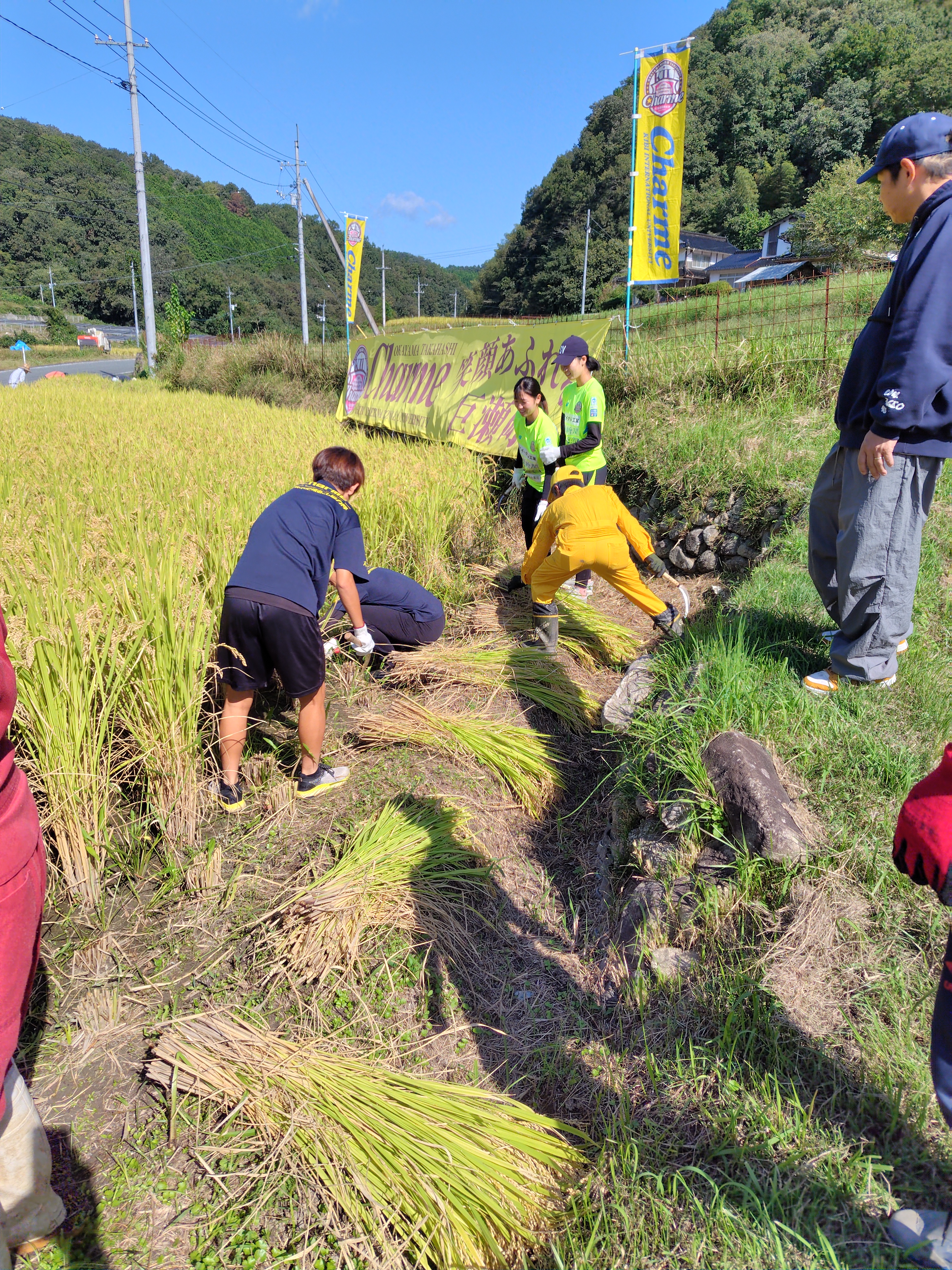 シャルムまちおこし協力隊の、根本さん伊藤さん他シャルムの選手5名が稲刈り🌾に来て収穫を手伝ってくださいました‼️